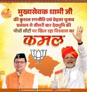 शत प्रतिशत स्ट्राइक रेट के साथ तीसरी बार देवभूमि उत्तराखंड में सीएम धामी के नेतृत्व में भगवा लहराया
