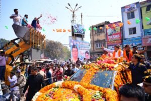 रोड शो के दौरान गाजे बाजे और आतिबाजी के बीच पुष्प वर्षा से उत्सव जैसा बना माहौल