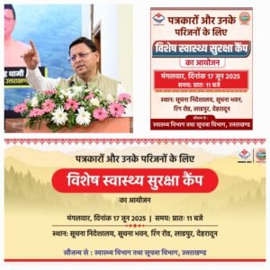 देहरादून । उत्तराखण्ड में पत्रकारों और उनके परिजनों के स्वास्थ्य की चिंता को लेकर राज्य सरकार बेहद गम्भीर है। मुख्यमंत्री पुष्कर सिंह धामी के निर्देश पर, मंगलवार 17 जून को सूचना निदेशालय, रिंग रोड, देहरादून में एक विशेष नि:शुल्क स्वास्थ्य सुरक्षा कैम्प का आयोजन किया जा रहा है।यह कैम्प स्वास्थ्य विभाग व सूचना विभाग के संयुक्त प्रयास से प्रातः 11 बजे से शुरू होगा।