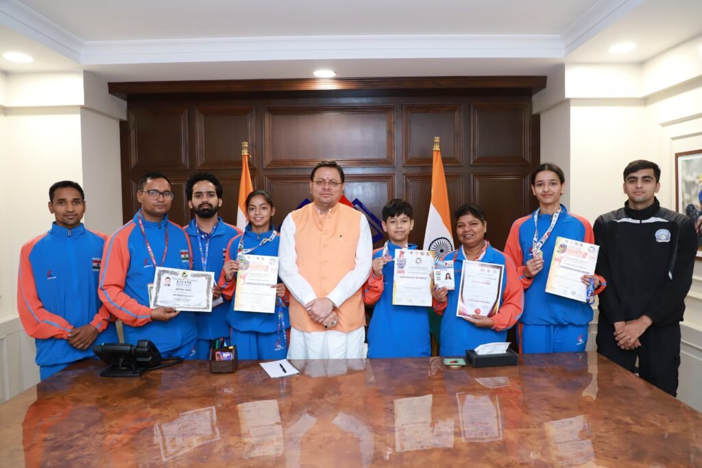 मुख्यमंत्री श्री पुष्कर सिंह धामी ने मंगलवार को नई दिल्ली में राज्य के तीन होनहार कराटे चौंपियन्स को सम्मानित किया। मुख्यमंत्री ने कहा कि सम्मानित किए जा रहे सभी प्रतिभाशाली खिलाड़ी राज्य के उज्ज्वल भविष्य की नींव हैं। उन्होंने कहा, इन खिलाडियों ने अपनी खेल प्रतिभा से अपने माता-पिता के साथ ही उत्तराखंड का मान भी बढ़ाया है। तीनों खिलाड़ियों अनामिका, मैत्री व क्रियांश ने 5-6 जुलाई 2025 को कोलंबो, श्रीलंका में आयोजित 9वीं साउथ एशियन कराटे चौंपियनशिप में भारत का प्रतिनिधित्व करते हुए रजत, कांस्य व कांस्य पदक जीते है, मुख्यमंत्री ने इन खिलाडियों के उज्जवल भविष्य की कामना की तथा भविष्य के आयोजनों में सफलता के लिये शुभकामनाये भी दी।