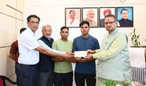 मृतक उपनल कार्मिक के परिवार को त्वरित सहायता राशि का चैक सौंपते सैनिक कल्याण मंत्री गणेश जोशी