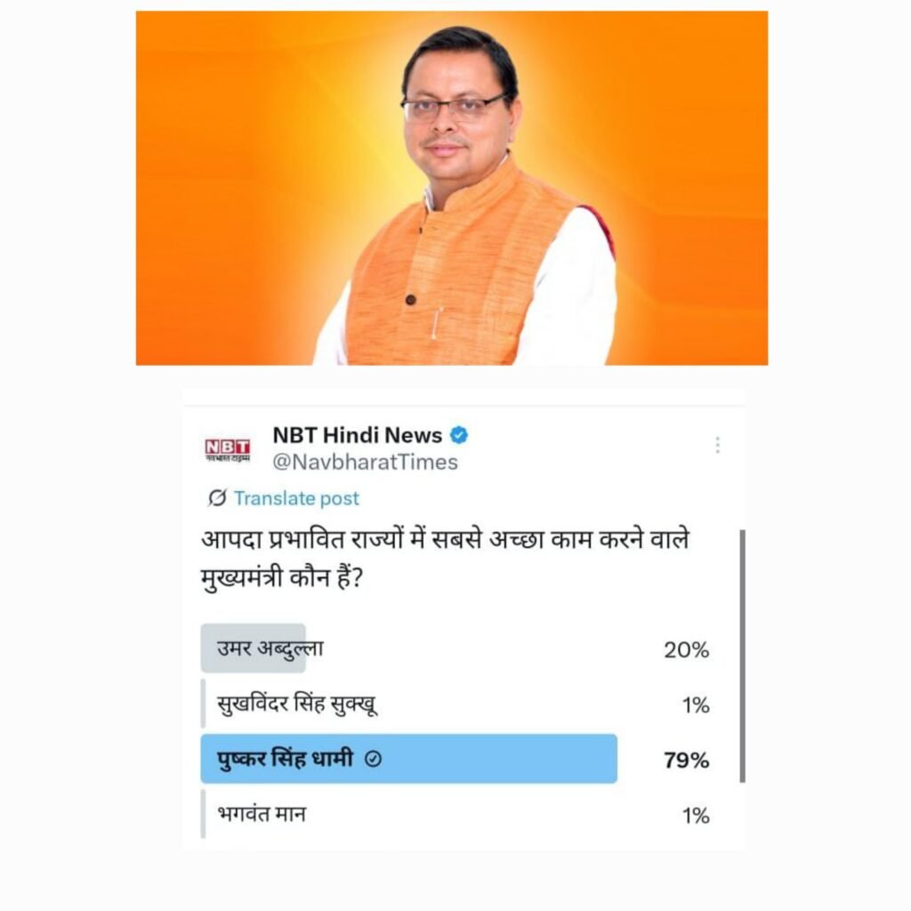 देश के आपदा प्रभावित राज्यों के मुख्यमंत्रियों के कामकाज पर आयोजित टाइम्स ग्रुप के सर्वे में उत्तराखंड के मुख्यमंत्री पुष्कर सिंह धामी ने शीर्ष स्थान हासिल किया है। देश के आपदा प्रभावित राज्यों के मुख्यमंत्रियों के प्रदर्शन को लेकर नवभारत टाइम्स ने हाल ही में एक ऑनलाइन सर्वे कराया। सवाल था “आपदा प्रभावित राज्यों में सबसे बेहतर काम करने वाले मुख्यमंत्री कौन हैं?” इस सर्वे में चार नाम शामिल थे उमर अब्दुल्ला, सुखविंदर सिंह सुक्खू, पुष्कर सिंह धामी और भगवंत मान।