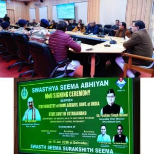 मुख्यमंत्री श्री पुष्कर सिंह धामी की उपस्थिति में आज मुख्यमंत्री आवास में उत्तराखंड शासन एवं भारत–तिब्बत सीमा पुलिस (आईटीबीपी) के मध्य स्वस्थ सीमा अभियान के अंतर्गत एक महत्वपूर्ण समझौता ज्ञापन (MoU) पर हस्ताक्षर किए गए। इस अवसर पर स्वास्थ्य मंत्री डॉ. धन सिंह रावत एवं कैबिनेट मंत्री श्री सौरभ बहुगुणा भी उपस्थित रहे।